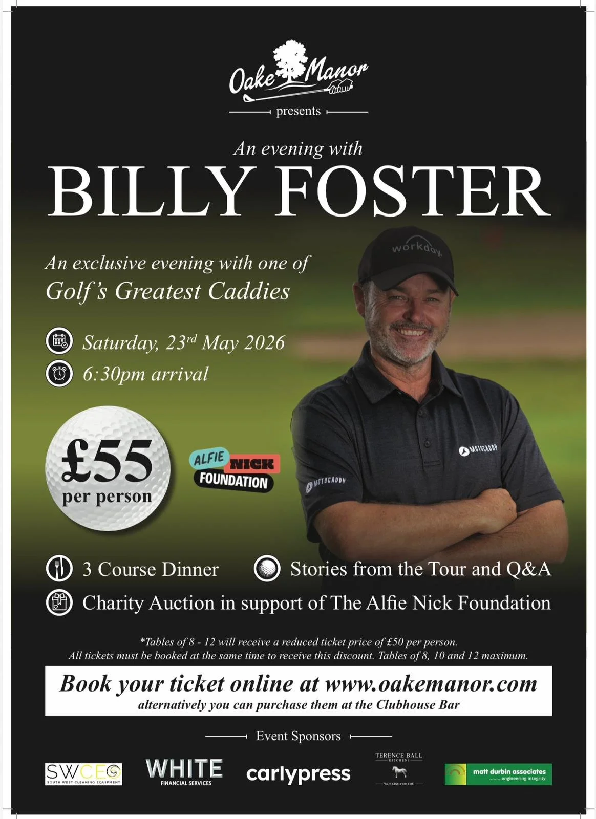 Our friends at Oake Manor Golf Club are hosting an evening with one of golf’s greatest caddies, Billy Foster.
